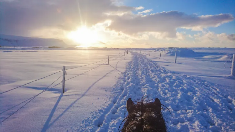 Discover the beautiful landscape opening up between the mountains and sea in southern Iceland. We ride along the Gljúfurá river to the banks of the Ölfusá river, with views of the famous volcanos Hekla and Eyjafjallajökull, weather permitting. We stop for a lunch break before continuing our ride towards the mountains and along Mt. Reykjafjall, where both sheep and horses graze in the summer. Awaiting us back at our farm are coffee and home-baked cake. During the winter season, we stop at our hotel for soup of the day before continuing our ride towards the mountains.