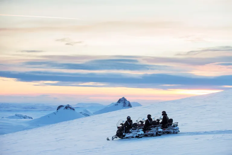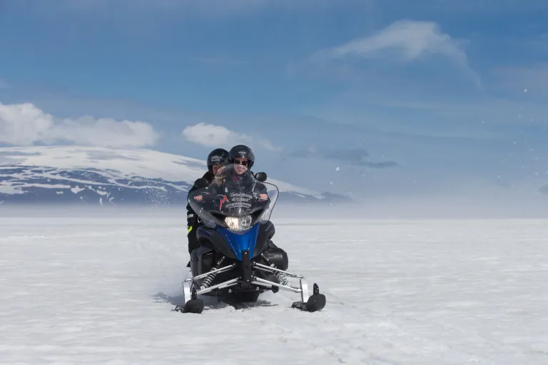 The Golden Circle tour allows visitors to get in touch with some of Iceland’s most famous and exciting natural phenomena. Our first stop is at Þingvellir National Park, which is one of Iceland's most significant historical sites. It's the home of Iceland’s first parliament which was founded in 930 AD. From Þingvellir we head along mountain tracks toward the world-renowned geothermal area around Geysir Hot Spring, the one spouting hot spring on Earth after which all other spouting hot springs are named. From there we continue on to Gullfoss (“the Golden waterfall”) where your proximity to its edge is so close you can feel the spray of the glacial water on your face. Next, we kick the action into higher gear to get even closer to Iceland’s nature and go for a one-hour snowmobile tour on Langjökull, Europe’s second-largest glacier.