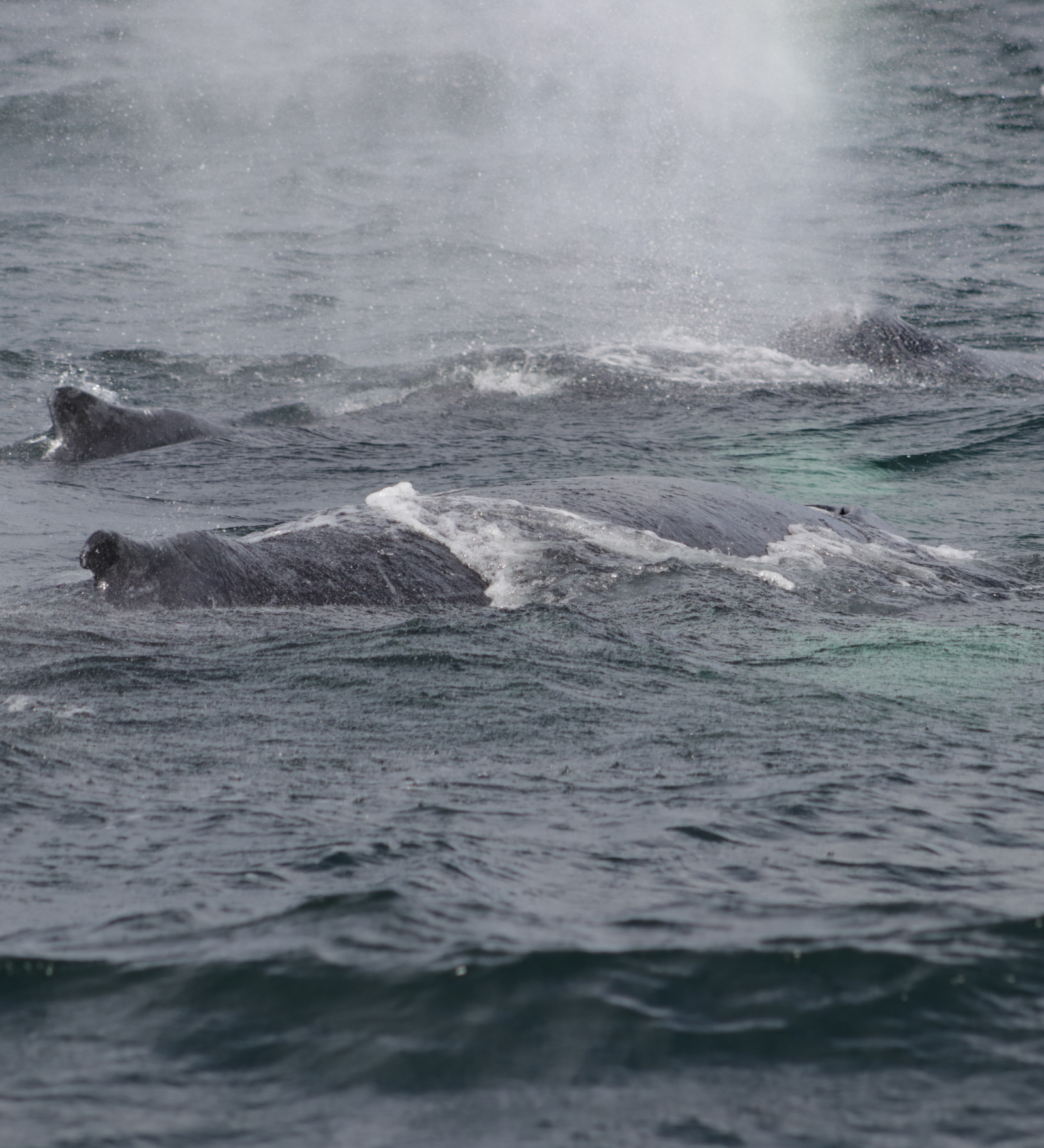 14:00 - We headed out onto a much calmer bay with sunlight peaking through the cloud cover. As we began heading out, some small splashes caught our eye, a pod of 8-10 harbour porpoises! We spent a lovely couple minutes admiring these elusive little cetaceans, before continuing on. We came across a blow soon after, and saw the signature fluke dive, our first humpback whale sighting. As we waited for this individual to surface, we were distracted by some more blows in the distance, and decided to head over. Sure enough, we came across our second humpback, which was apparently very busy beneath the surface as it went for some very rapid, very long fluke dives, only surfacing for a couple moments before each. So, we continued on, and spotted some more blows on the horizon. As we got closer, we realized it was a pair of humpback whales, swimming peacefully together. When they had gone for a fluke dive, we suddenly saw a large pectoral fin above the surface, slamming down multiple times, a pec-slapping humpback! This individual was part of yet another pair, bringing the grand total of humpbacks on our tour to a whopping 6 individuals! Once this pair went down for a fluke dive, we began heading back towards the harbour, quite pleased with the sightings we had.