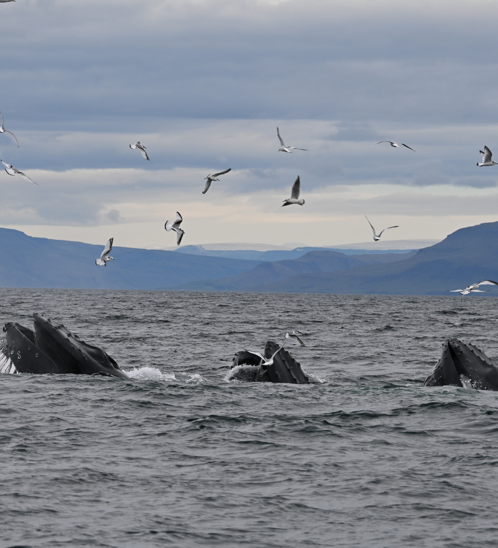 12:00 - With great weather and close to perfect sea, we headed out into the bay, unexpecting the great tour that was going to happen. Off the bat, after sailing for 20 minutes, we started seeing more and more birds, and spotting our first minke whales. As dorsal fins came up and down, we then encountered a group of 5 humpback whales, as we saw one of them breach meters away from us ! Altogether, surrounded by minke whales, this group kept on bubble netting and lunge feeding, with one particular individual leading the group activities and one juvenile trying to keep up the pace. Further away, more minke whales and another group of 4 whales were doing all the same. As we exchanged between groups and saw the whales roam around and change their positions as well, we even passed by a pod of 4 white beaked dolphins. In our last minutes, enjoying more lunge feeding from these humpbacks, we noticed our 4th main specie, 5 harbor porpoises calmly passing next to us, luckily close enough for all to see. With 8 humpback whales, more than 10 minkes, seeing all our main species and plenty of feeding, it really was one of the best tours of the last months.
