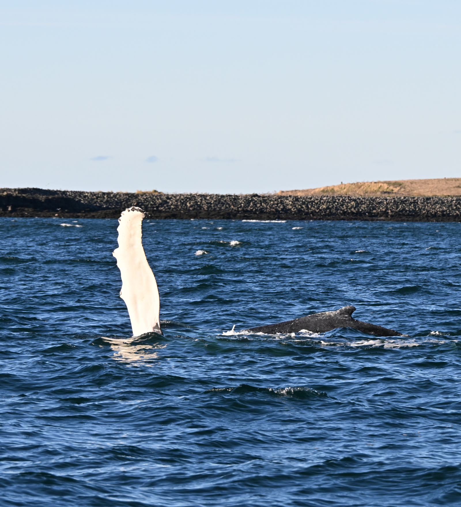 14:00 - This afternoon, we layered up and headed out. After a little ride we spotted the blows of two humpback whales. It is always special when we have a pair of humpbacks feeding together. Right away, we got a double fluke! After multiple surface sequences, one of our humpbacks started pectoral slapping! It looked like they were waving to us and so we waved right back! After such a great viewing we waved this duo goodbye and went to see what else was about. We then spotted the small blow of one minke whale. This individual came nice and close and it was amazing to see this elusive species so close! After multiple surfaces, this minke swam to other waters and so we were off. We then spotted the back of another solitary minke whale. This minke demonstrated how quick and elusive they can be. After three nice encounters, it was then time to head back to port.