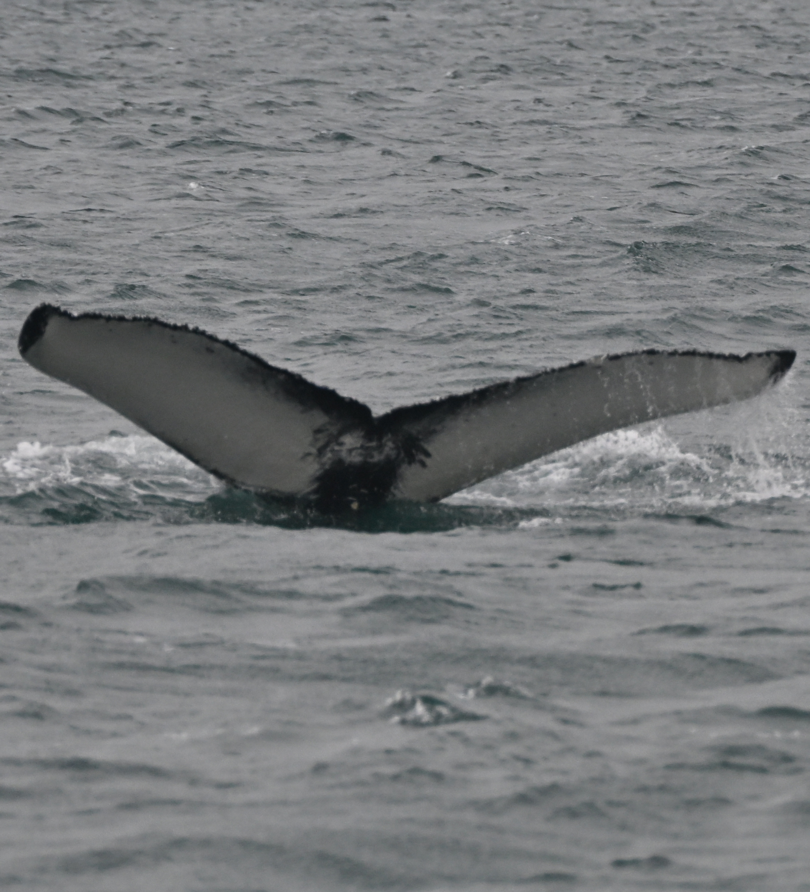 11:00 - Today we went out with the fresh cold Icelandic wind on our faces. Good that we wore as many layers we could and the overalls protected us! Our first encounter of the day was not one, but 2 humpback whales right next to the harbour! They were in between the islands of Engey and Viðey, and we could have a look at them. However, the amount of boats around made us want to go out in the bay to see what Faxaflói had for us! And after travelling for a while, we spotted a continuous splash: a pod of about 12 white-beaked dolphins! They were very curious and came straight next to our boat! They loved when we started speeding up, and they came to bowride, very playful. Some of them were close, but keeping a distance and splashing around a bit to... mate! They were still mating during October, the last ones of the season! Then, we decided to go back to close to the islands, to have a look at those humpbacks again. We took a while to find them, because, although it was a shallow area, they were really taking their time under the surface! But we managed to see them a couple of times, as they led the way to the harbour. Lovely cold morning!